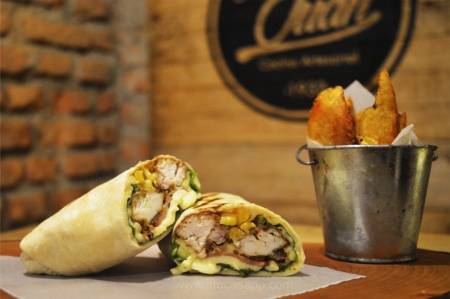Pan servilleta, fajitas de pollo crocante, panceta, maíz tierno, queso mozzarella, vegetales frescos y salsa alcaparrada.