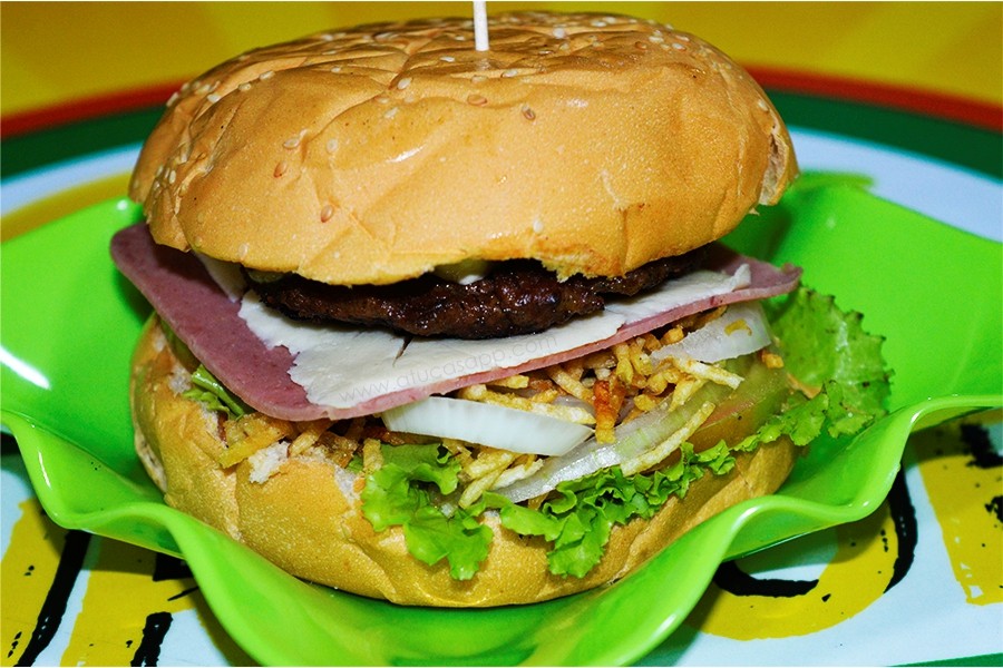 Carne de res, Cebolla, tomate, lechuga, jamón, queso y salsas.