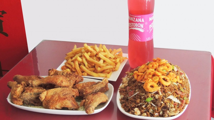 1 Caja de Arroz chino con 7 carnes, 1 pollo entero frito, papas a la francesa, 1 litron.