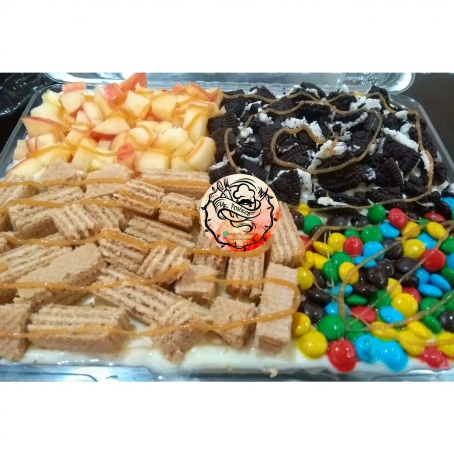 32 oz. Postre elaborado con galletas dulces, leche condensada y crema de leche (nata). con toppins de manzana, Cocosette, galletas Oreo y m&m´s