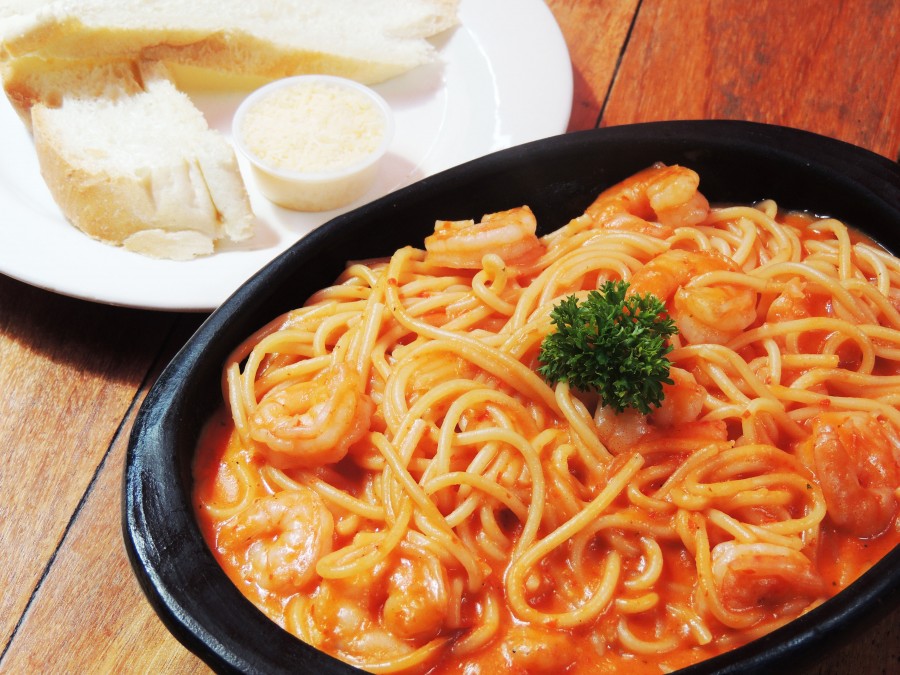 Pasta larga en Salsa de la casa con camarones de excelente calidad, acompañado pan y queso parmesano.