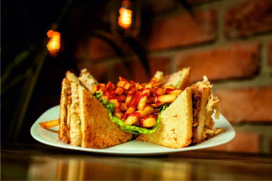 Sandwich 100% artesanal. Pan, carne molida, pollo desmechado, jamón, queso, tomate, lechuga, cebolla caramelizada y papas a la francesa.