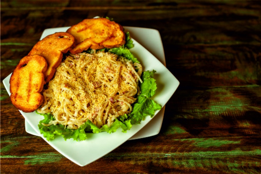 Pasta larga con salsa blanca, tocineta y mucho parmesano.